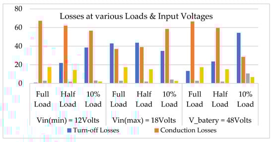 Conduction, turn-off, transformer and body diode losses of the CFIBDC converter at various input voltages (Vin(min), Vin(max) and Vo) and loads (100%, 50% and 10% of load).