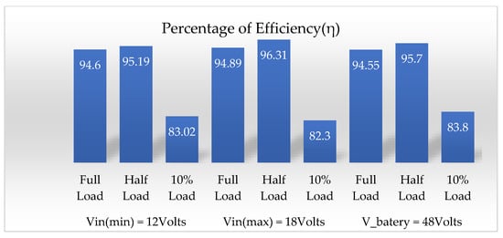Efficiency of the current-fed isolated bidirectional DC-DC converter (CFIBDC) at various input voltages (Vin(min), Vin(max) and Vo) and loads (100%, 50% and 10% of load).