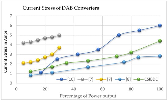 The current stress of various topologies compared to that of the proposed CFIBDC converter is shown in Table 5. High current stress on the switching devices leads to more conduction losses of the switches, which in turn reduces the efficiency of the converter and requires a more oversized heat sink. The current stress for a conventional dual active-bridge (DAB) converter is less during the light load condition, but it increases gradually. The conventional DAB [7] has been operated with two inductors, L1 and L2, to increase the light load efficiency of the DAB converter. If this converter uses only one inductor, L1, it will have higher current stresses, but with two inductors, L1 + L2, it offers less current stress, giving higher efficiency at light load conditions. The voltage-fed series resonant DAB [11] converter offers less current stress, as shown in Figure 17. As per the percentage of full load current, the proposed current-fed series resonant converter with an inductive output filter offers lower current stresses from light load to full load compared to any other dual active-bridge converter topologies as can be seen in Figure 17.