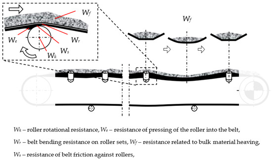 It is impossible to formulate a general thesis that any of the above-listed resistance components are the most important because their structure depends on the configuration of the belt conveyor [5]. In the case of inclined conveyors, the energy consumption is determined by the grade resistance. For an average slope of the route of 2°, the gradient resistance is about 50% and for 5° it is even 80% of total resistance to the motion of a conveyor. These resistances do not depend on the operational parameters of the conveyor’s structural elements but instead on the configuration of the route while not allowing for a reduction in energy consumption. A quite different situation is the case of the primary resistance WG. The components of WG (1) resistances are as follows (Figure 1) [1]: