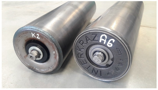 Two rollers with a shell diameter of 133 mm and a length of 465 mm with 6305 C3 bearings were selected for the tests (Figure 3). Rollers differed in the type of hub, weight and quality of components, e.g., bearings. Selected rollers were marked: A6—a roller with a cast-iron hub and K2 with a pressed steel hub. The A6 roller used high-quality bearings from a reputable manufacturer, while the K2 roller was equipped with low-quality bearings.