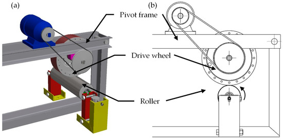 Tests according to the LRM method were carried out on the stand shown in Figure 6 [13]. The roller was installed in a rigid pivotally supporting frame. The drive and adjusting of the roller radial load were implemented using a toothed belt.