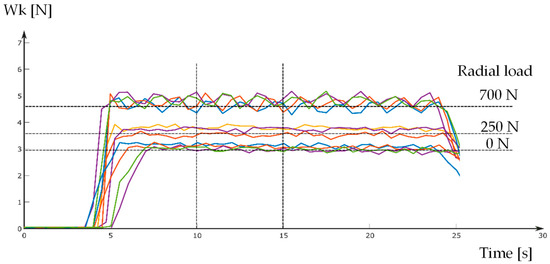 Figure 8 shows the waveforms of the A6 roller rotational resistance for different states of radial force load. Depending on this load, the average values of the resistance force ranged from 1 N to 2.8 N.