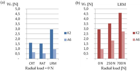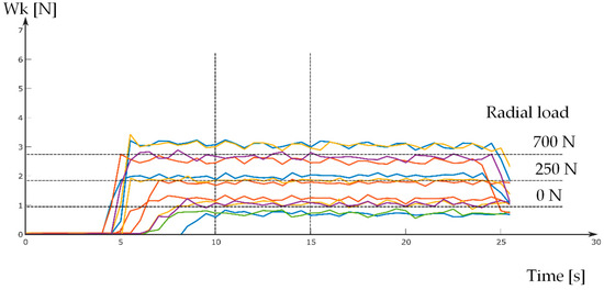 Figure 9b shows the value of the rotational resistance of the tested rollers and their changes depending on the radial load. Along with the increase in the radial load, the values of the rotational resistance of the tested rollers increase proportionally.