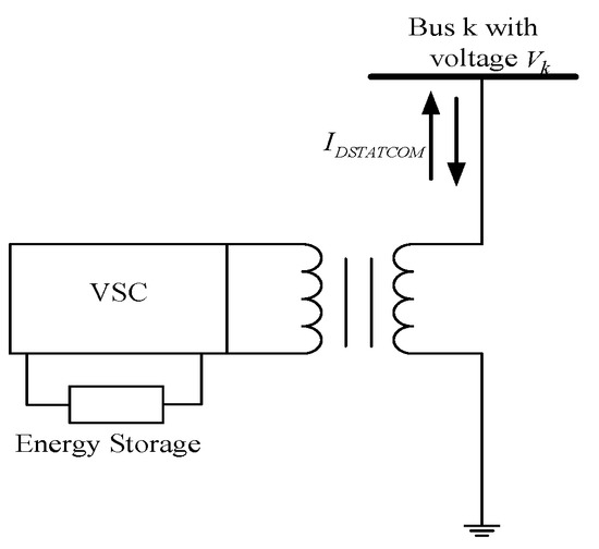 The applied load flow method in this work is BIBC-BCBV-based backward-forward sweep, which is used to derive all the variables. In a real system, the voltage of buses are less than 1 p.u.; therefore, the voltage at (k + 1)th bus is also 1 p.u. The installation of DSTATCOM is carried out for compensating the voltage at (k + 1)th bus and to maintain the required reactive power in the system, as shown in Figure 5. Hence, it can be said that in steady-state conditions, it is used for regulation of voltage, as well as to reduce the system losses and make the balance of the reactive power to the system the same for supplying and absorbing. The current injected by the DSTATCOM, i.e., (IDSTATCOM), is in phase quadrature with reference to bus voltage, as shown in Figure 6.