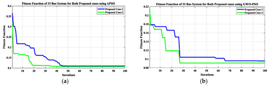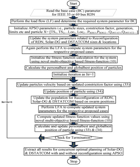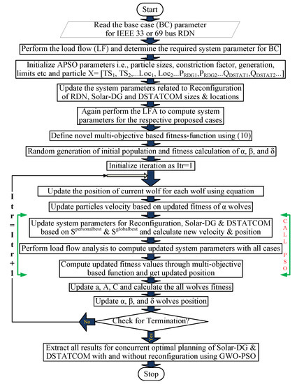 A novel multiple objective-based fitness-function () is introduced in this section. This , as given in (10), consists of five significant operational and performance parameters as indices. The minimization of this unique is utilized for the optimal allocation of multi solar-DG as a real power DG and DSTATCOM as a reactive power DG. It also includes the impact of network reconfiguration by the incorporation of APSO and GWO-PSO techniques in IEEE 33 and 69-bus RDN. Hence, this remarkable novel is used for the optimal positioning and sizing of multi DGs (solar-DG and DSTATCOM), with and without reconfiguration, by utilizing the APSO and GWO-PSO techniques.