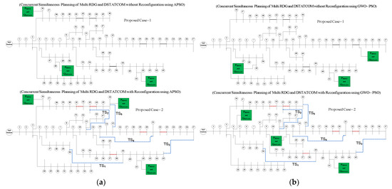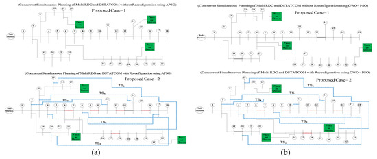The detailed review of distribution system planning, methodology, objectives, and outcomes based on different literature are tabulated in Table 1. From this detailed review, it is found that none of the authors have considered the proposed “novel multiple objective-based fitness-function” for the “concurrent optimal planning of multi solar-DG and DSTATCOM with and without reconfiguration”. Therefore, this work is carried out efficiently using the APSO and GWO-PSO techniques, in which two proposed cases have been studied: Proposed Case-1 (PC-1)—Concurrent optimal planning of multi solar-DG and DSTATCOM without the impact of RDN reconfiguration, and Proposed Case-2 (PC-2)—Concurrent optimal planning of multi solar-DG and DSTATCOM with the impact of RDN reconfiguration.