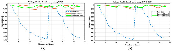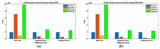 This analysis using APSO and GWO-PSO in PC-2, as compared to PC-1, for IEEE 33-bus RDN shows an improved voltage profile, with a maximum VD of 0.1082 p.u. and 0.1077 p.u., respectively. It was 0.1869 p.u. in the base case (BC), as demonstrated in Table 6 and Figure 10. A significant reduction is noticed in the PLoss with 0.0121 MW and 0.0101 MW using APSO and GWO-PSO, respectively. The QLoss is decreased to 0.0100 MVAr and 0.0084 MVAr, as given in Table 6 and Figure 11, Figure 12, Figure 13 and Figure 14. Consequently, the SCLLCurrent is reduced by 96.42% and 99.31%, which is why the short circuit/fault tolerance capacity of the system is enhanced, which can be seen in Table 6. Hence, the RS in PC-2 for IEEE 33-bus RDN are enhanced by 98.26% and 99.67%, as compared with BC data, as illustrated in Table 7 and Figure 18. From the economic perspective, savings in loss and ENS costs are noticed. Hence, the total cost is reduced to USD 23,304.857/year and USD 22,453.3336/year using APSO and GWO-PSO, respectively, for IEEE 33-bus RDN, as presented in Table 8 and Figure 15.