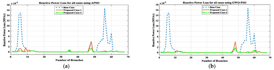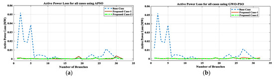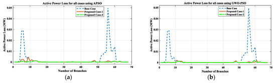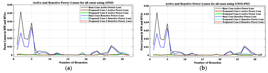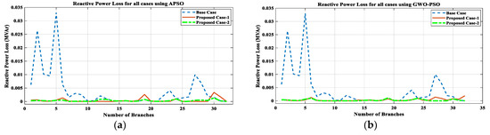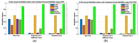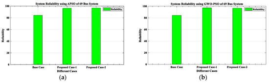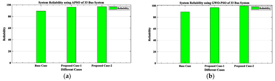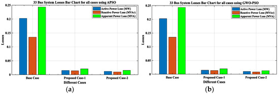 After analyzing the results of the proposed work, a comparison between the proposed work results with other existing works is presented in Table 14. From this comparative analysis, it is found that the proposed work’s outcomes, as tabulated in Table 6 and Table 11, are much better than the existing works. While commenting on the superiority of results between APSO and GWO-PSO, the result obtained using GWO-PSO is superior in terms of reduction in VD, PLoss, QLoss, SCLLCurrent, and RS, along with increments in economic benefit. Hence, it can be seen that the proposed methodology for the concurrent optimal planning of multiple DGs (Solar-DG and DSTATCOM) in IEEE 33 and 69-bus reconfigured RDN using APSO and GWO-PSO is productive from the viewpoint of reduction in real power loss and reactive power loss and improvement in the voltage profile, as well as the short circuit level of line current, and its reliability.