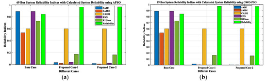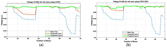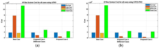 Similarly, the analysis for IEEE 69-bus RDN using APSO and GWO-PSO in PC-2 shows an improved voltage profile, with a maximum VD of 0.1053 p.u. and 0.1015 p.u., respectively. It was 0.1908 p.u. in the base case (BC), as demonstrated in Table 9 and Figure 20. A significant reduction is noticed in the PLoss with 0.0106 MW and 0.0087 MW using APSO and GWO-PSO, respectively. The QLoss decreased to 0.0070 MVAr and 0.0062 MVAr, as given in Table 9 and Figure 21, Figure 22, Figure 23 and Figure 24. Consequently, the SCLLCurrent decreased by 96.99% and 99.47%, which is why the short circuit/fault tolerance capacity of the system is enhanced, which can be seen in Table 9. Hence, the RS in PC-2 for IEEE 33-bus RDN is enhanced by 96.78% and 96.72%, as compared with BC data, as illustrated in Table 12 and Figure 28. From the economic perspective, savings in loss and ENS costs are noticed. Hence, the total cost is reduced to USD 21,926.545/year and USD 21,422.1786/year using APSO and GWO-PSO, respectively, for IEEE 33-bus RDN, as presented in Table 13 and Figure 25.