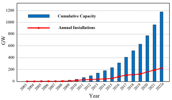 Cumulative and annual PV installations from 2003 to 2021 with an estimate for 2022.