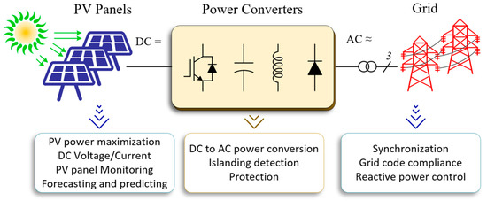 Undoubtedly, this growth has triggered the development of PV power converters. These converters are essential for interfacing PV modules with the AC loads, as shown in Figure 2 [10]. As a result, it is used to ensure efficient and reliable energy conversion. While PV power converters differ in configuration, their major functions remain the same. These functions are determined according to the type of loads.