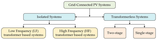 Schematic diagram of isolated and non-isolated grid-connected PV energy conversion systems.