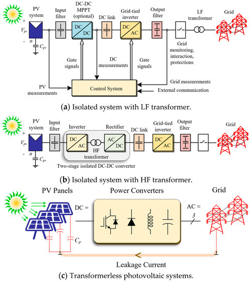 Transformerless-based PV systems can be achieved by removing the transformer from the isolated systems. As a result, small size, low weight, low cost, and high-efficiency systems are achieved [22,24,25,27]. Meanwhile, about a 2% increase in the overall conversion efficiency is achieved using these systems [28]. However, it is critical to note that a current will flow through the parasitic capacitance () as shown in Figure 4c. This current is called leakage current.