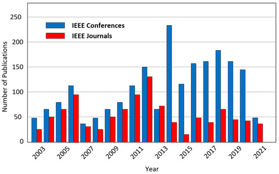 Generally, transformerless PV systems can use two- or single-stage power converters, as shown in Figure 3. The first stage of the transformerless system boosts the PV voltage, while the second stage converts the boosted DC voltage to an AC waveform. On the other hand, single-stage converters perform both boosting and inversion processes. Recently, different topologies have been made to increase the power density and efficiency of single-stage inverters [20,24,25]. Among single-stage PV topologies, Impedance-Source Inverter (ZSI) was first invented in 2003 [37,38]. It represents one of the dominant and promising single-stage inverters for the transformerless grid-connected system. There has been a significant increase in publications on the ZSI topology and its developments in recent years. Based on the database of IEEE Xplore, Figure 5 shows a summary of ZSI-based topologies published over the past two decades. It can be observed from Figure 5 that extensive research was conducted to explore various aspects of the basic ZSI circuit, develop novel topologies, and propose enhanced modulation techniques to enhance conversion and switching performance [39].