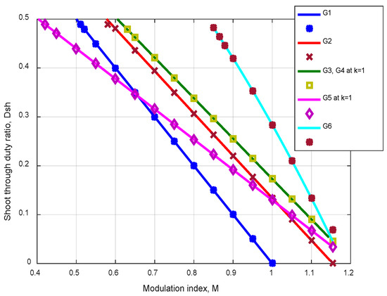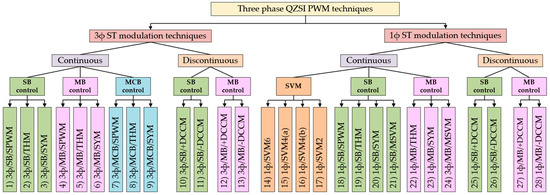 Based on the method of achieving ST mode, the PWM schemes for QZSIs can be divided into Three- and Single-phase ST schemes (i.e., 3ΦST and 1ΦST, respectively), as depicted in Figure 7 [47,48,49,50]. As shown, it can be divided into a) continuous and b) discontinuous schemes. Moreover, it’s further subdivided into (i) Simple-Boost (SB), (ii) Maximum-Boost (MB), and (iii) Constant-Boost (CB) control methods. There are also classifications depending on the modulating signals used. At this level, we have sinusoidal (SPWM), third harmonic (THM), symmetrical (SYM), DC-Clamped (DCCM), and modified SVM (MSVM) schemes. The common and dissimilar aspects of most of the analyzed modulation techniques include implementation complexity, voltage gain, current and voltage stresses, the effective switching frequency, output voltage spectrum, and switching losses were examined in [48,49]. Table 1 lists the performance characteristics of all modulation techniques and maximum phase voltage (/), the mean capacitor voltage (/) and the boosting factor for each modulation scheme. Based on the results, the PWM techniques are classified into five groups: G1 to G5.