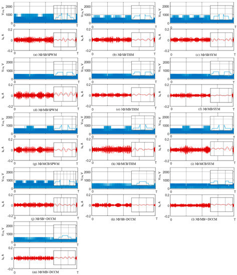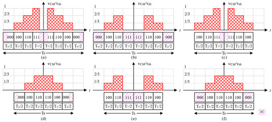 As a result of (9), Table 3 shows the CMV-RMS for all schemes. The results are divided into six groups, from CMF1 to CMF6. It is worth noting that 3Φ-ST schemes have the same waveform as in Figure 9a, whereas 3Φ/MB schemes have a Figure 9b waveform. Furthermore, 1Φ-ST schemes have the same waveform as Figure 10e, while 1Φ/MB have the waveform of Figure 10g. The difference between them is and [55].
