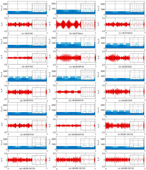 Figure 12 gives CMV and leakage current waveforms for 1Φ ST control methods. From the results, the following notes can be made: