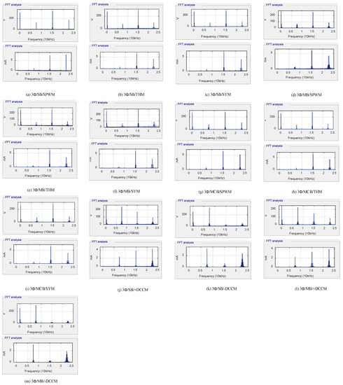 - Both 3Φ/MB/SPWM, 3Φ/MB/THM, and 3Φ/MB/SYM have the same value as CMV. On the other hand, the value of leakage current in the case of 3Φ/MB/THM is lower than that of 3Φ/MB/SPWM and 3Φ/MB/SYM.