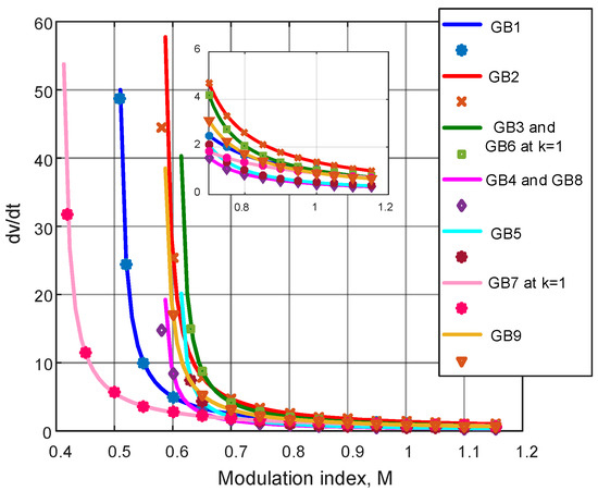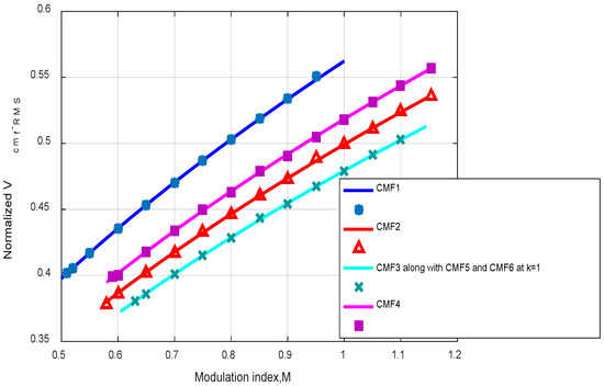 For , the 1Φ/SVM6 method has the same CMV of MB case of Figure 8b. So, the maximum CMV and are determined from