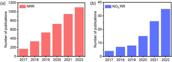 Number of publications in (a) NRR and (b) NO3−RR studies. Data were obtained from the Web of Science based on an article title of “nitrogen reduction reaction” and “nitrate reduction reaction”, respectively.
