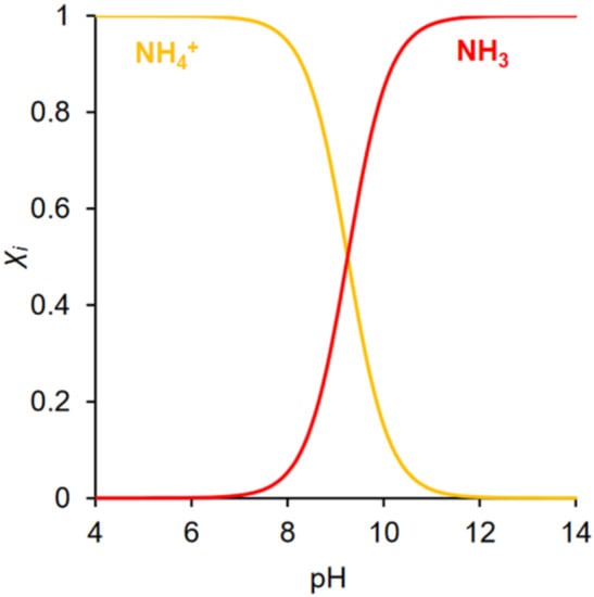 The molar fraction of NH4+ ions and unionized NH3 as a function of pH. Adapted from Ref. [39] Copyright 2022, MDPI.