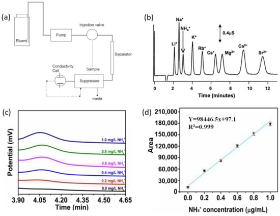A typical IC instrument includes a pump, an injector, a column, a suppressor, and a recorder or data system (Figure 4a). Ion exchange separation mainly occurs in the column packed with an ion exchanger, which is commercially available. When the samples containing certain cations are injected into the chromatography instruments, the cations flow with the eluent through a column. The speed of the cations flowing through the column differs depending on their interaction with the ion exchanger, and they are then separated. The conductivity detector is then usually used to detect the separated cation, which results in a series of peaks with different retention times. Each cation is identified based on its retention time, and the area of the peak represents the concentration of the cation (Figure 4b). In this case, the peak area is proportional to the concentration of the cation. By comparing the obtained peak area with the standard calibration curve, the concentration of the cation can be quantified (Figure 4c,d).