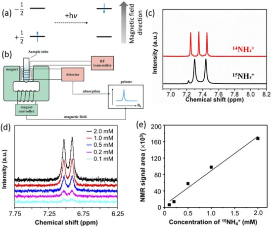 (a) Absorption process in NMR. (b) Schematic representation of a typical NMR spectrometer. Adapted with permission from Ref. [52] Copyright 2019, Georg Thieme Verlag KG. (c) 1H NMR spectra of 14NH4+ and 15NH4+ produced from NRR reaction using 14N2 and 15N2 isotopes. Adapted with permission from Ref. [45] Copyright 2021, Royal Society of Chemistry. (d) 1H NMR spectra of 15NH4+ standard solutions with various concentrations and (e) corresponding calibration curve. Adapted with permission from Ref. [53] Copyright 2020, American Chemical Society.