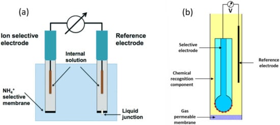 There are typically two types of electrodes that can be used to measure the dissolved ammonia; i.e., an ammonium ion-selective electrode and an ammonia gas sensing electrode. As its name suggests, the ammonium ion-selective electrode (NH4+-ISE) measures NH4+ ions dissolved in the solution. It measures the potential difference between the reference electrode and the ion electrode (Figure 6a) [55]. This electrode is equipped with an NH4+ ion-specific membrane, typically a polyvinylchloride (PVC) membrane. Before performing ammonia detection using NH4+-ISE, the sample solution is acidified to convert NH3(aq) into NH4+ ions. When the electrode is placed into the sample solution, the potential in the ion electrode develops against a reference electrode (typically Ag/AgCl) [56]. The value of the potential is proportional to the concentration of the NH4+ ion in the solution, in accordance with the Nernst equation (Equation (10)). The concentration of NH4+ can be quantified using the calibration curve.