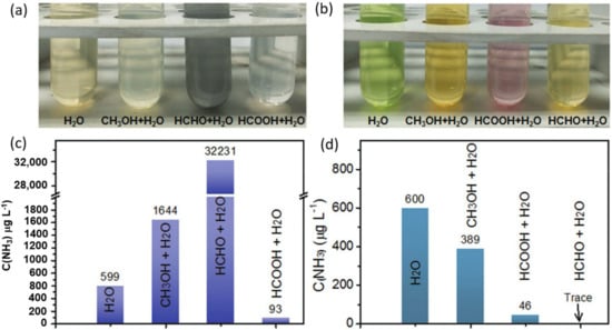 Photograph of the various ammonia solutions in the presence of 40% volume of methanol as the sacrificial reagent and its derived oxidation products determined by (a,c) Nessler’s method and (b,d) indophenol blue method. The ammonia concentration was 600 µg L−1 in all experiments. Adapted with permission from Ref. [35] Wiley-VCH 2021.