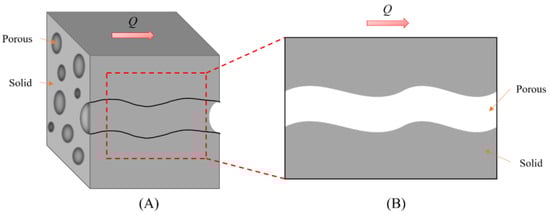 (A). Simplified model of pore structure space of the porous materials. (B). Representation unit on the longitudinal section.