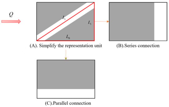 where Lt is the actual length of the fluid path and L0 is the characteristic length in the direction of the macroscopic driving potential gradient, i.e., it is the length along the heat flow. To use the series-parallel model to represent the ETC of the porous materials, the geometry of Figure 2 is simplified to the form shown in Figure 2A.