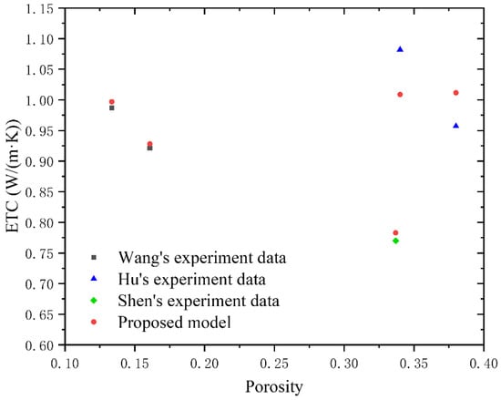 Due to the large porosity of autoclaved aerated concrete blocks tested by Jing [28], the data of Wang [12], Shen [29] and Hu [31], which can be found in Table S2, were used to verify the accuracy of the proposed model at low porosity. As shown in Figure 5 when the porosity of the porous materials is 0.1–0.4, the ETC model can accurately predict the ETC of the porous materials tested by Wang [12] and Shen [29]. However, there is a relatively large deviation between our model prediction and Hu’s data. It should be pointed out that only tortuosity can be derived from Hu’s data for the absence of fractal parameters in his experiment. Therefore, the predicted effective thermal conductivity based on Hu’s data is defined by Equation (6), which does not include the modification of fractal parameters. The fractal parameter effects are contained in the prediction of Wang’s and Shen’s data; hence, the deviation between the prediction and experimental data is quite small. This also validates the effectiveness of the proposed fractal model in prediction of the ETC of porous materials.
