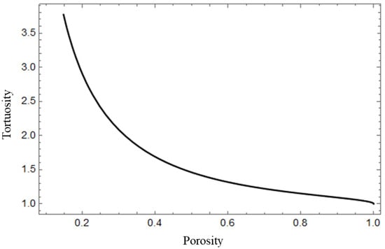 Equation (23) explains the porosity of the porous materials as a function of the tortuosity. As shown in Figure 6, the tortuosity of the porous materials decreases rapidly with the increase in the porosity, but the decreasing tendency becomes slower. The definition of tortuosity is the actual length of the fluid path divided by the characteristic length in the direction of the macroscopic driving potential gradient. Therefore, when the porosity is 1, meaning that the pores occupy all the space, i.e., Lt =L0, then the tortuosity approaches the minimum value of 1.
