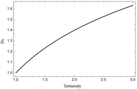 The irregularity of the pore channels is mainly represented by the tortuous fractal dimension of the porous materials. The tortuous fractal dimension of the porous materials tends to become larger, and the pore channels tend to be more complex and irregular. The tortuous fractal dimension is affected by both the material tortuosity and pore diameter distribution, according to Equation (11). Figure 7 depicts the variation of the tortuous fractal dimension with tortuosity. The tortuous fractal dimension rises when the tortuosity increases. With the increase in tortuosity, the pore channels tend to be more complex and irregular, which leads to the increase in the tortuous fractal dimension.