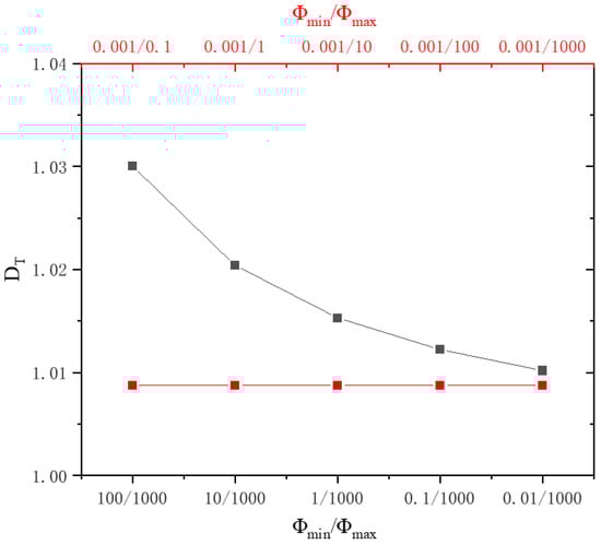 According to Equation (11), the influence of pore diameter distribution on tortuous fractal dimension at different Φmin/Φmax can be calculated. As shown in Figure 8, we assume that the x axis at the bottom of Figure 8 maintains the maximum pore diameter of 1000 μm, and the x axis at the top of Figure 8 maintains the minimum pore diameter of 0.001 μm. Figure 8 shows the tortuous fractal dimension decreases with the decrease in Φmin/Φmax when the maximum pore diameter is 1000 μm. This due to the complexity of the tortuosity decrease with the increase in pore diameter distribution range. The increase in maximum pore diameter has little effect on the fractal dimension of tortuosity while the minimum pore diameter is constant.