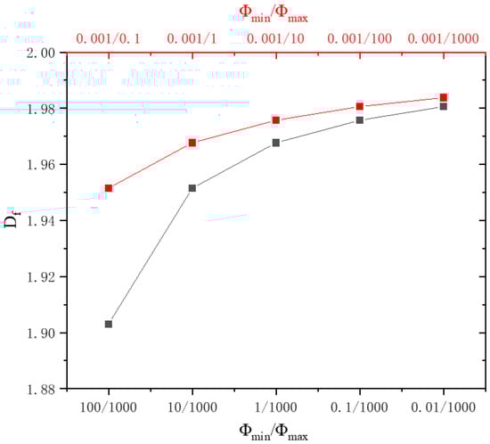 When the maximum pore diameter of the porous materials is 1000 μm and the minimum pore diameter is 0.001 μm, the area fractal dimension varies with the pore diameter distribution as shown in Figure 10, indicating that the area fractal dimension increases with the decrease in Φmin/Φmax. The pore structure of porous materials is more complicated when the pore size distribution is larger, and the area fractal dimension characterizes the spatial irregularity of the pore distribution of porous materials. Therefore, the area fractal dimension increases with the increase in the pore diameter distribution. On the other hand, the area fractal dimension under the condition of constant minimum pore diameter and variable maximum pore diameter is larger than the constant maximum pore diameter constant and variable minimum pore diameter condition, which might be attributed to the average diameter being smaller in the constant minimum pore diameter condition. In other words, for the same porosity, smaller pore diameter gives larger area fractal dimension.