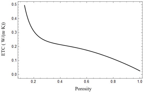 According to the data from Jing’s [28] paper, the impact of porosity on the ETC of autoclaved aerated concrete was studied. The variation of the ETC of the porous materials can be found in Figure 11, indicating that the ETC decreases with porosity. This is because the proportion of solids in the porous materials decreases, the proportion of air increases with the porosity increases and the thermal conductivity of air is much smaller than that of the solid.