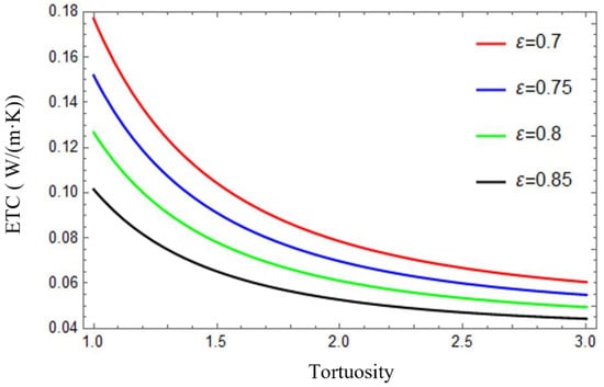 The ETC of the porous materials is affected by the tortuosity as shown in Figure 12. It can be seen from this figure that the ETC decreases with the increase in tortuosity. For example, when the porosity is 0.7, the ETC of the porous materials decreases by approximately 66% as tortuosity increases from 1 to 3. This can be attributed to the ratio of the series part increasing with the increase in tortuosity. The series model represents the lowest limit of the ETC, and the ETC decreases with the increase in the proportion of the series part. Meanwhile, the ETC reduction rate decreases slowly with the increase in porosity, which is consistent with the actual situation. When the porosity is 0.85 and the tortuosity increases from 1 to 3, the ETC decreases by about 55%. This indicates that the effect of the tortuosity on the ETC increases as the porosity decreases. This phenomenon can also be explained by the series-parallel model. Under the same porosity condition, the parallel model represents the maximum thermal conductivity of the porous materials, while the series model is the minimum. When the tortuosity is 1, the weight coefficient of the parallel model is 1, and the weight coefficient of the series model is 0. When the tortuosity increases, the weight coefficient of the parallel model decreases, and the weight coefficient of the series model increases; therefore, the ETC of the porous materials decreases.