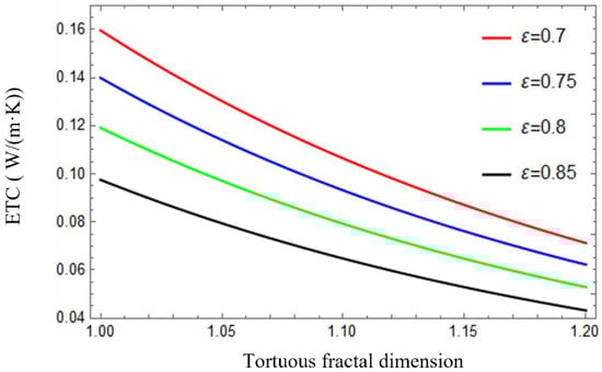 The analysis of the tortuous fractal dimension of porous materials shows that the tortuous fractal dimension is mainly distributed in the limit 1.0 to 1.2. Figure 13 shows that the ETC of the porous materials decreases as the tortuous fractal dimension increases; for instance, when the material porosity is 0.8, the increase in the tortuous fractal dimension from 1 to 1.2 reduces the ETC by about 54%. This is due to the fact that with the increase in the tortuous fractal dimension, the tortuous structure of pore channel becomes more complex, which makes the series-parallel distribution of solid and gas more complex and increases the internal thermal resistance of the porous materials.