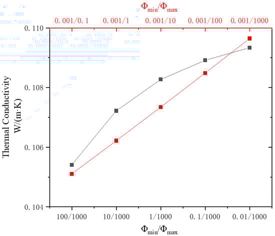 Pore diameter distribution affects the ETC mainly by affecting the area fractal dimension and the tortuous fractal dimension. However, the ETC is barely affected by the area fractal dimension. Therefore, the ETC is mainly influenced by the tortuous fractal dimension under different pore diameter distributions. Figure 14 shows the influence of pore diameter distribution on the ETC when the maximum pore diameter remains 1000 μm and the minimum pore diameter is 0.001 μm. It can be seen that the ETC increases with Φmin/Φmax decreases. This phenomenon can be explained by the results in Figure 8. When Φmin/Φmax decreases, the tortuous fractal dimension decreases as well. On the other hand, the decrease in the tortuous fractal dimension results in the increase in ETC of the porous materials, as shown in Figure 13. Therefore, the decrease in Φmin/Φmax also leads to the increase in the ETC of the porous materials.