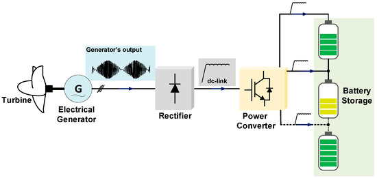 For several MESs, the three-phase output voltage of the electrical generator will be oscillating because the rotational speed of the turbine will be variant [23,24,25]. Accordingly, a three-phase rectifier is necessary to rectify the oscillatory voltages and currents. Then, the power converter will act as a dc/dc converter in this mode to control the power flow and charge the batteries. If the power converter is modular, the power flow can be controlled to balance the batteries during the charging process.