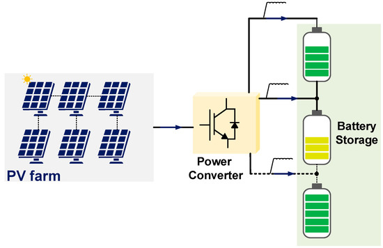 The modular structure can increase the harvested energy from the PV modules because individual maximum power point tracking (MPPT) controllers can be employed on the PV module’s level [12]. Decentralising the power converter stage will provide modularity and scalability so the PV system can generate high power using small semiconductor devices [13]. This also means that, for any partial fault in few SMs, the PV system can remain in service with the proper control, which bypasses the faulted SMs [14]. If the employed SM’s converter has an embedded high-frequency transformer (HFT), the bulky line transformer, which connects the LSPV system to the MV grid, can be eliminated, which saves massive weight, cost, and volume [15,16,17]. The modular structure allows for embedding batteries with the PV modules for energy storage, where these distributed batteries can store the excess energy and deliver it to the grid when the demand is higher than the supply, e.g., at nights. However, to achieve this function, the employed converters in the SMs should allow bidirectional power flow [18]. The modular structure will enable better charging and discharging processes for the batteries, which will improve their lifetime.