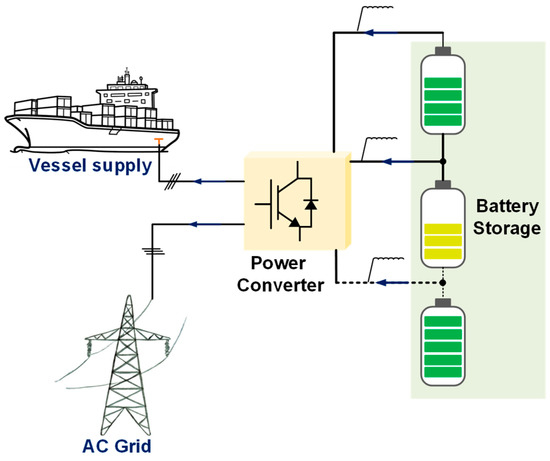 This mode is shown in Figure 4 where the stored energy in the batteries is transferred to the AC loads of either the shipping vessel or the AC grid. To achieve this mode, the power converter should be capable of operating as a dc/ac inverter in order to generate the output three-phase voltage and current. The power is directed to the grid when there is a low demand from the vessels’ perspective.