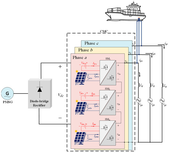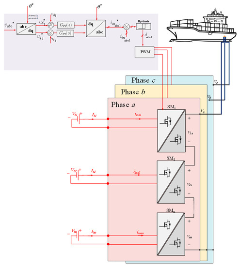 The output side of the three-phase CMC can be connected directly to the vessel or to the three-phase grid through the grid inductors Lg with an internal resistance rg. If the system is connected to the grid, the total voltage of each phase of the converter is the summation of the individual voltages of the series SMs. These total voltages can be expressed as: