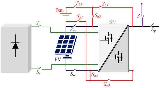 The electrical mode of operation is determined by the connection of the submodule (SM) converter to the sources and the loads. Figure 7 shows the electrical connection of one SM using single-pole double-through (SPDT) relays, which are cheap and are available in industry. Table 1 shows the status of the relays based on the required mode of operation.