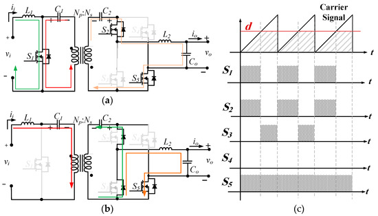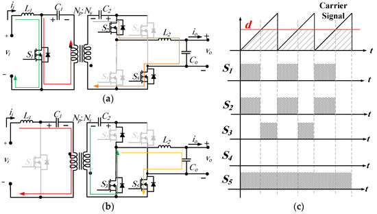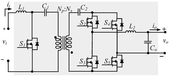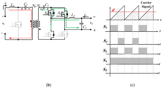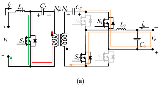 - During Stac1 (0 ≤ t < ton), switch S1 is turned on, so the input current ii increases and L1 is charged. The capacitors C1 and C2 discharge in the output load through S2 and S5. As shown in Figure 17a, L2 is charged in this state.