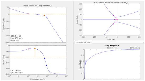 The controller of Mode 1 is tuned using the SISOTOOL toolbox in MATLAB/SIMULINK using the small-signal transfer function of the Cuk converter. The toolbox provides an interactive method to shape the loop gain and returns the calculated PI controller gains kp and ki. As shown in Figure 12, the PI controller gains are selected at kp = 0.5 and ki = 8 to provide stable loops and reasonable phase and gain margins.