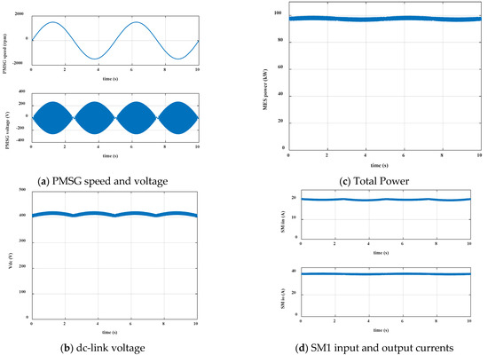 To show this mode, a MATLAB/SIMUINK case study is designed using the parameters shown in Table 2. Figure 13 shows the simulation results for this mode. Figure 13a shows the rotational speed of the PMSG with the resultant phase voltage. The dc-link voltage and the total power are shown in Figure 13b,c. The input current of the first SM in phase a is shown in Figure 13d with the SM output current to charge one battery pack charged at 200 V.