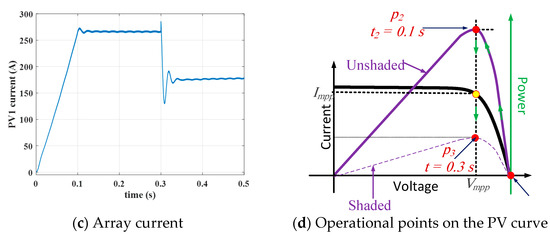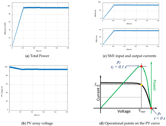 Figure 16a shows the total power of all PV modules together when the controller increases the power from zero to 96 kW (8 kW for each SM) in 100 ms. Figure 16b shows input voltage of one SM (output of the PV array). Figure 16c shows the output current of the SM to charge the connected battery pack. Figure 16d shows the operational points on the PV curves at t = 0 s and t = 100 ms.